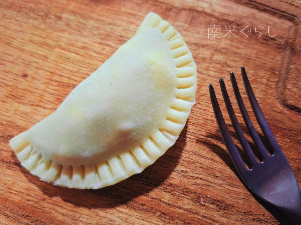 いろいろな包み方がありますが、今回はフォークの背でぎゅっと押さえています。生地に水をつける必要はありません。