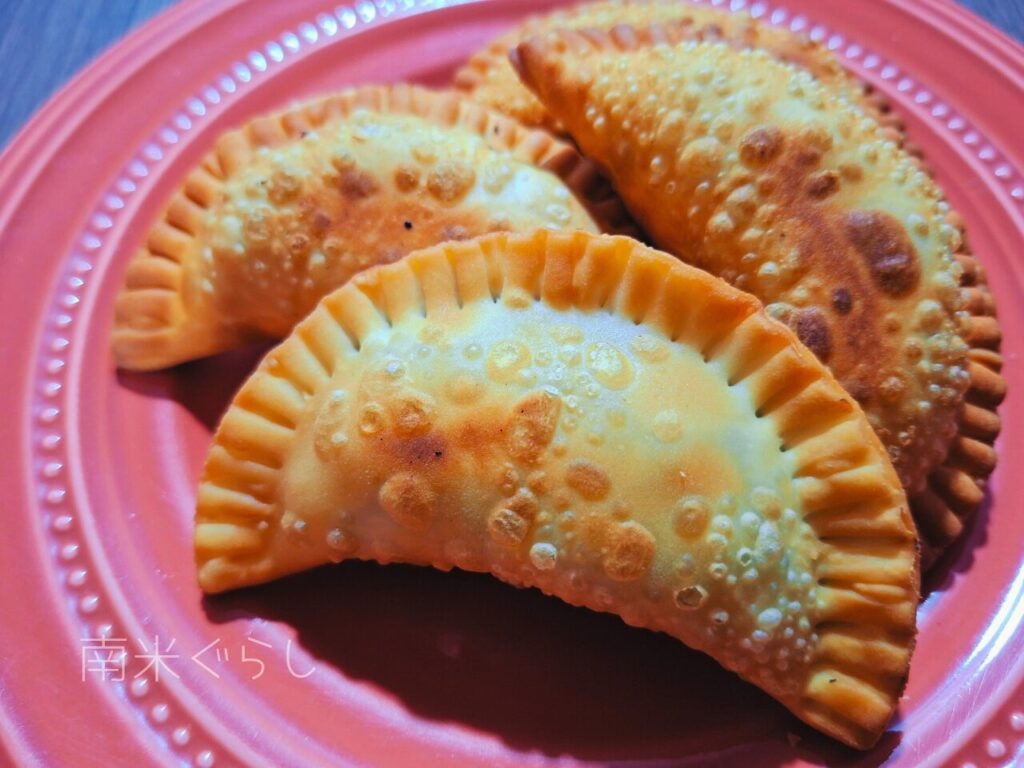 「エンパナーダ」は、総菜パンのような食べ物です。パイ生地に肉や野菜などの具材を包み、油で揚げて(もしくはオーブンで焼いて)調理します。